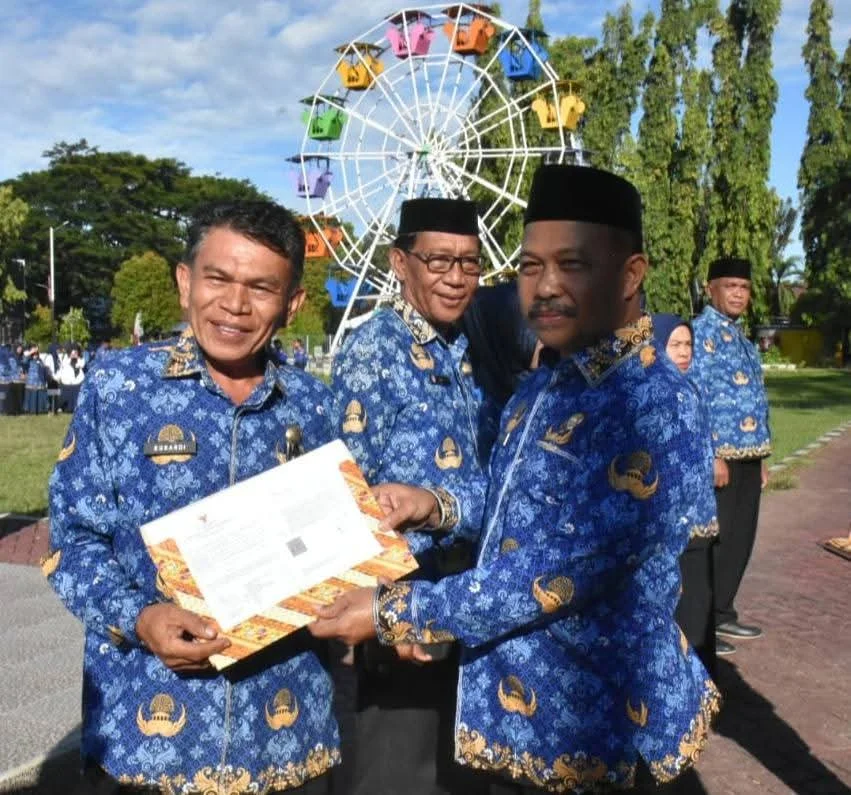 Surat keputusan (SK) purna tugas diserahkan langsung oleh Sekretaris Daerah kabupaten Boalemo, Sherman Moridu saat apel Korpri di lingkungan Pemkab Boalemo, bertempat di Alun-alun Tilamuta, Selasa 17 Juni 2025.